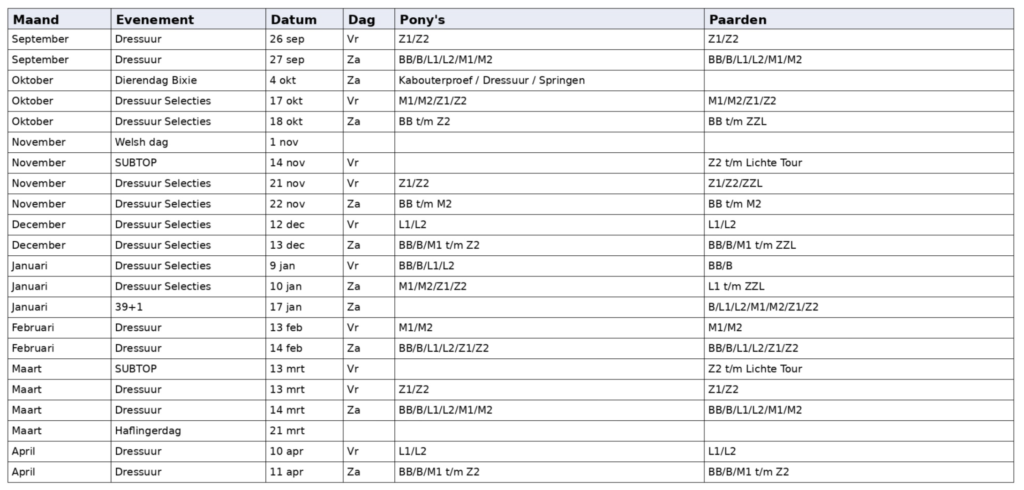 Bij ons zijn tijdens het gehele indoorseizoen dressuur op verschillende niveaus.